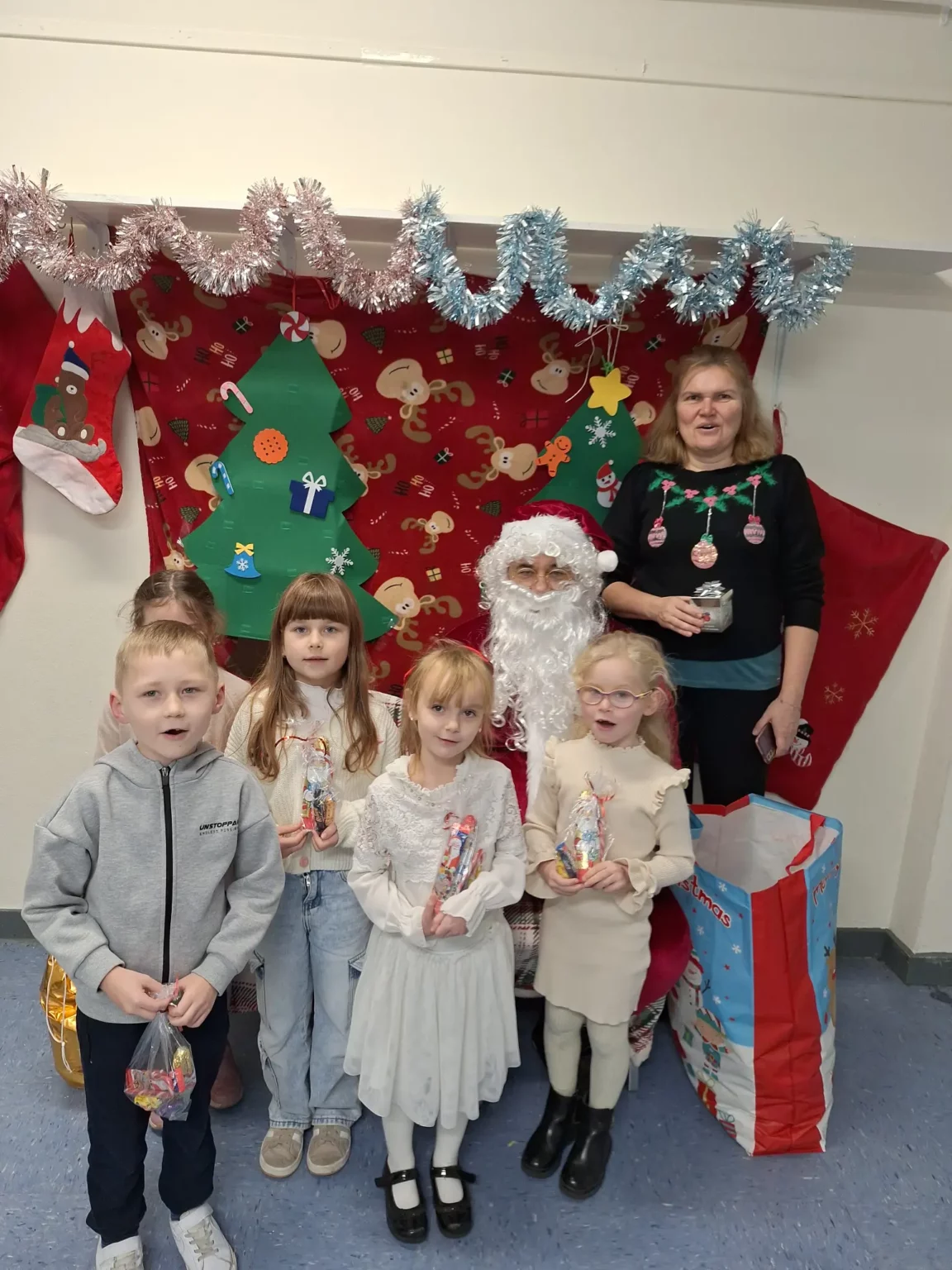 W naszej szkole obchodziliśmy Mikołajki w wyjątkowo radosnej atmosferze! Uczniowie z niecierpliwością oczekiwali na specjalnego gościa, który pojawił się w czerwonym kubraku i z długą, siwą brodą. Święty Mikołaj ugościł każdą klasę, witając uczniów ciepłym uśmiechem i pełnym workiem słodkich upominków.